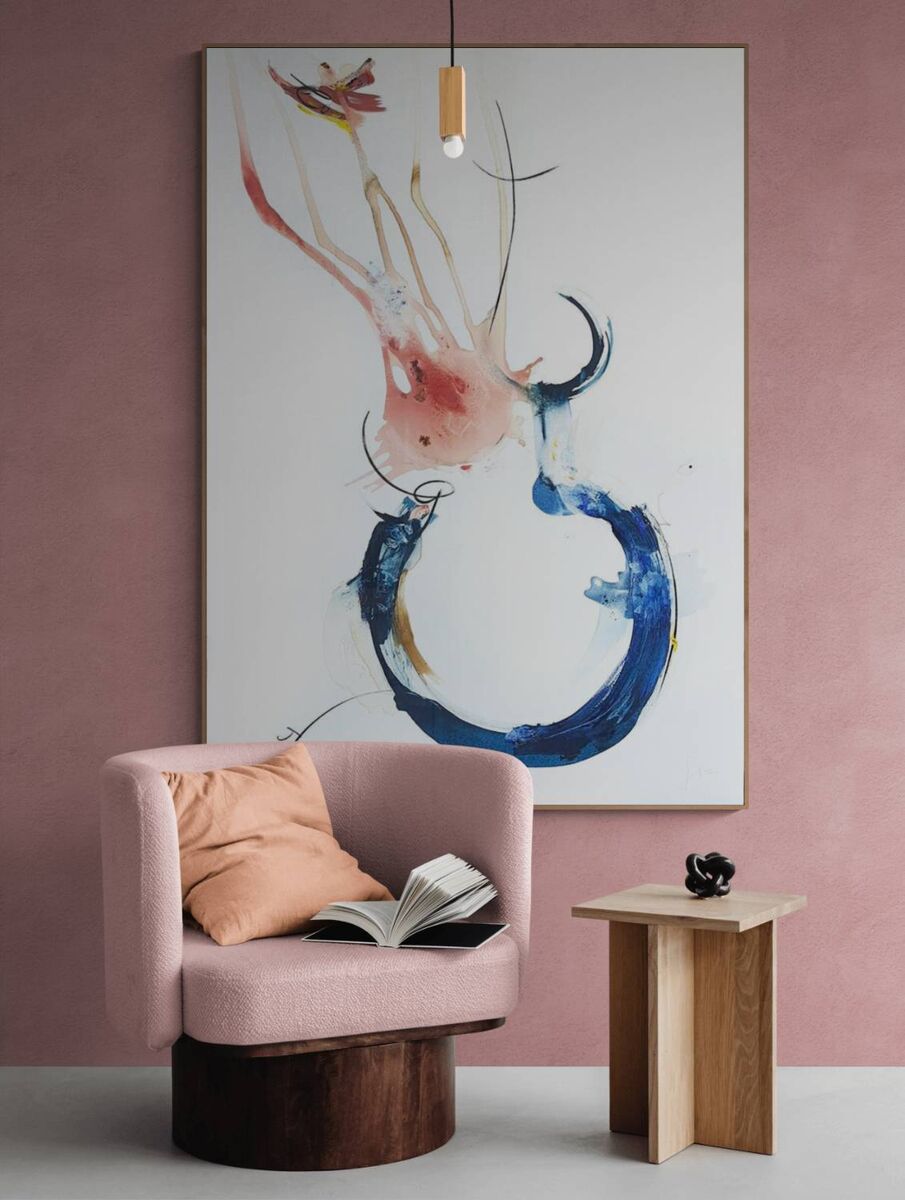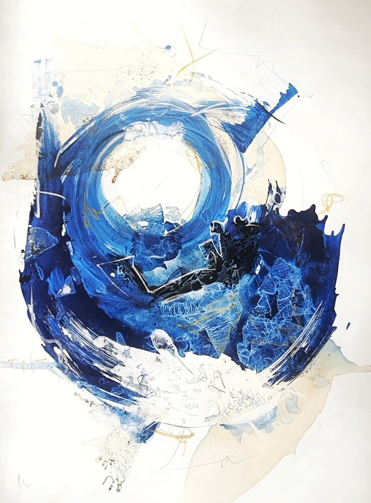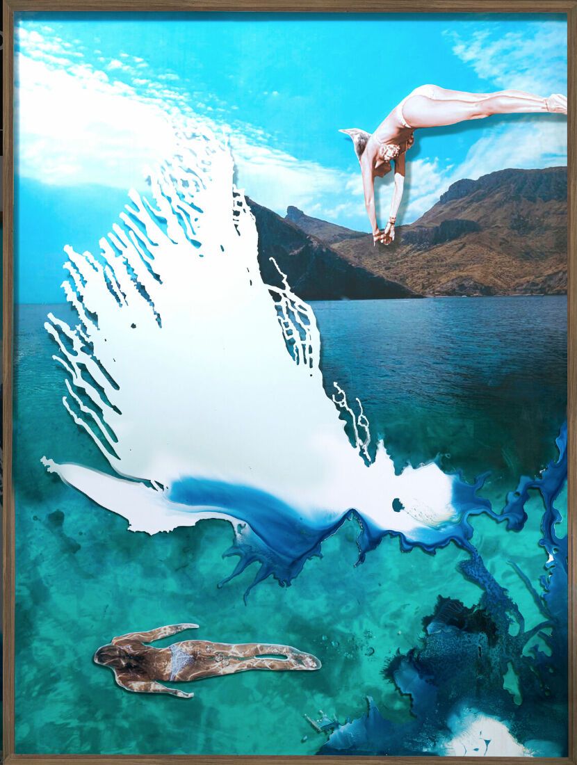 A double plexiglass mounted on a wooden frame. The paint and the photographies of the women are printed on the front plexiglass. Behind it, there is a second solid support with a composition of cristal clear Mediterranean waters and a cliff from the Tramuntana mountains. The shadows of the women and paint are projected on this second surface creating a three dimensional effect where the women seems to float in the air or in the water.