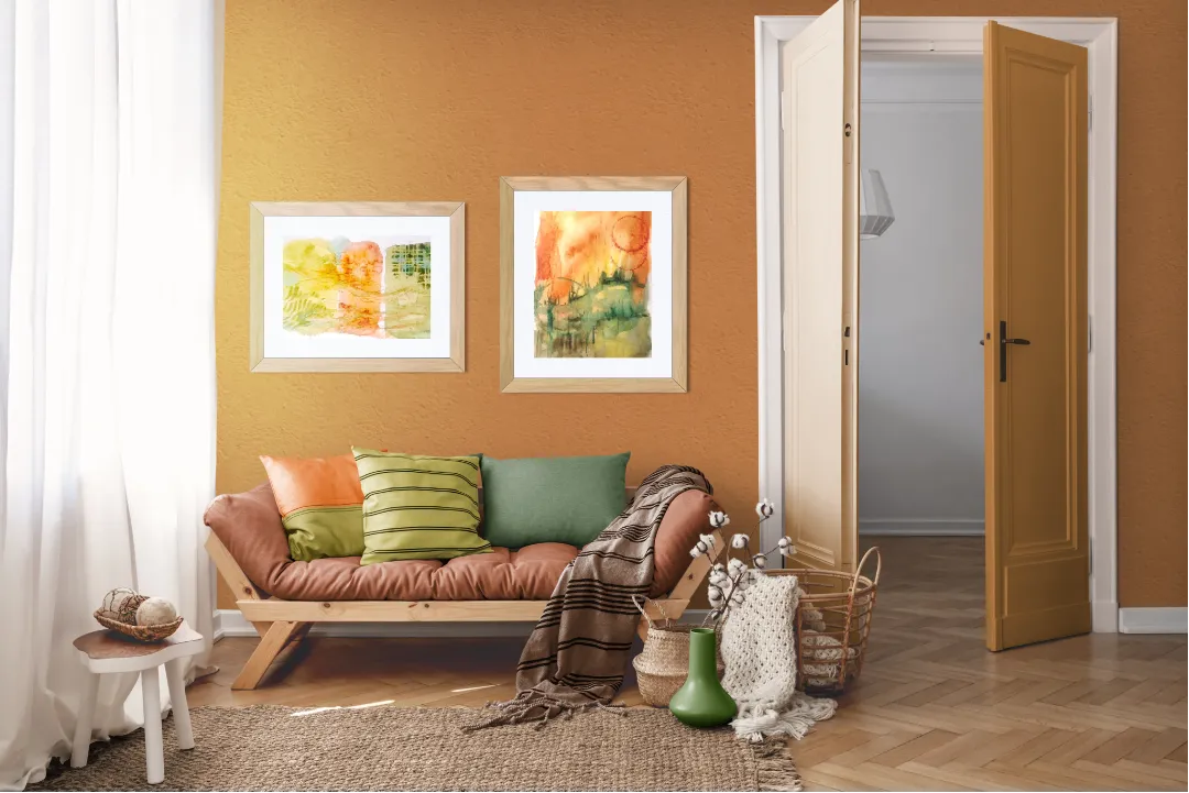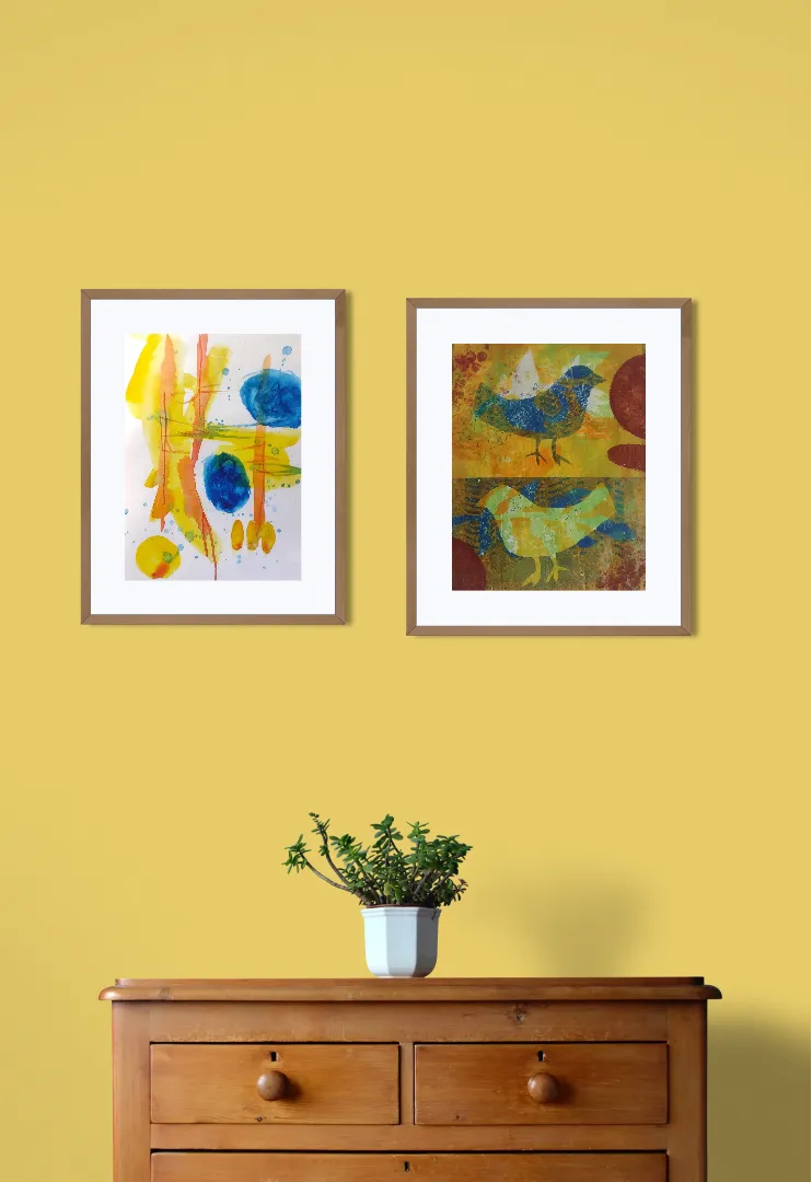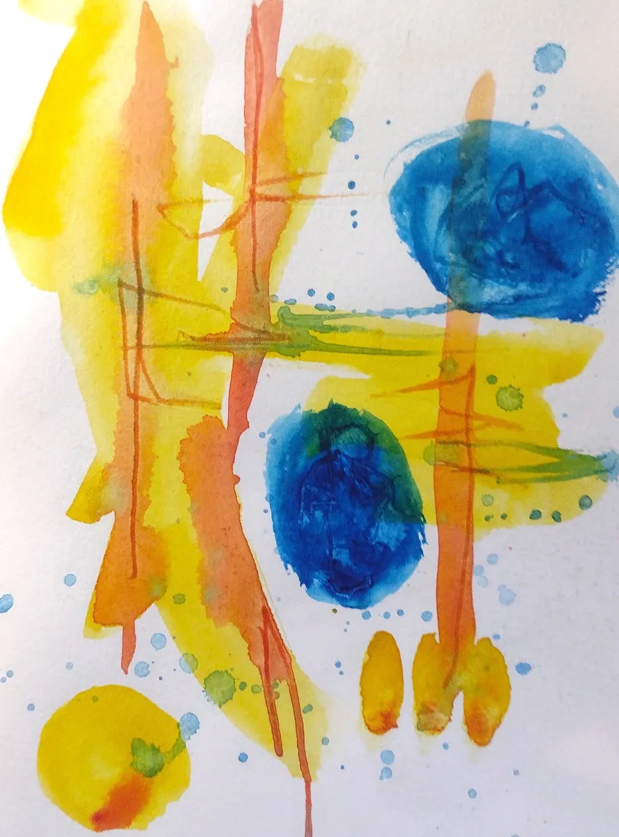 Original abstract watercolor in blue and yellow. Another one of my watercolors from late 2024. The complementary bright blue and yellow offset by orange vertical stripes and textured markings make the image interesting. The bright color choices and free forms just made me happy - thus, the title! My prints are made with the GICLEE process giving ultra-detailed image resolution and vibrant colors on premium paper.