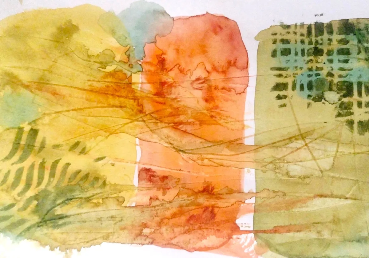 Original watercolor. Yellow, orange, and green forms intersected by flowing lines. I like using simple shapes in my watercolors and the three rectangles are an example. I love the texture of the flowing lines which suggested wind to me. Like the constant and restless wind one almost always sees and feels on the prairie. My prints are made with the GICLEE process giving ultra-detailed image resolution and vibrant colors on premium paper.