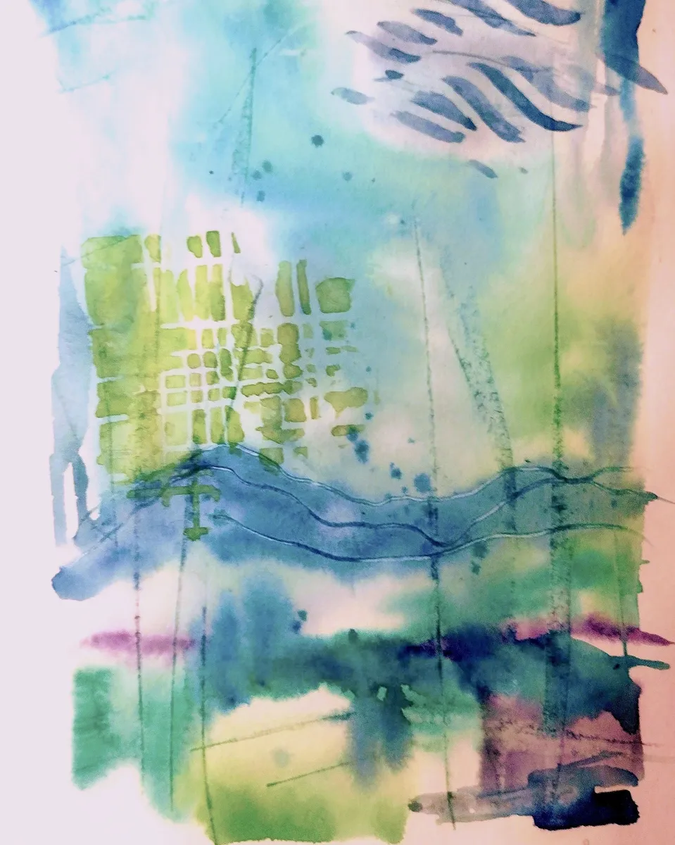 Original abstract watercolor suggesting a hilly landscape and stormy sky in shades of blues and aqua. My prints are made with the GICLEE process giving ultra-detailed image resolution and vibrant colors on premium paper.